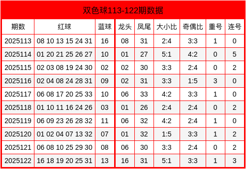 当期红球号码大小比为5:1,三区比为0:4:2,奇偶比为3:3,重号开出25,连码开出18,19,20。蓝球开出大奇数13。