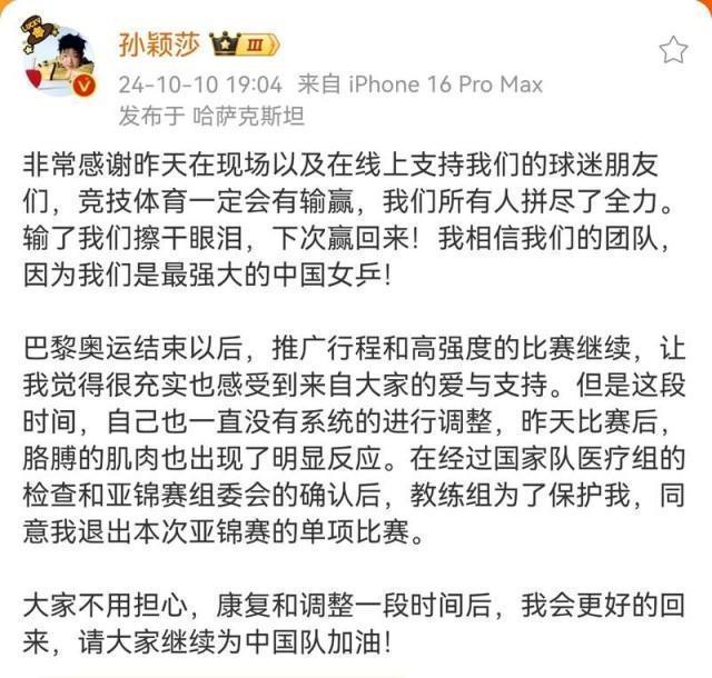 尽管中国女乒竭尽所能,然则最终中国女乒以1-3不歧视手,50年来初次输给日本队,在亚锦赛中屈居亚军。在比赛死心后,孙颖莎文牍我方退出亚锦赛女单比赛。在多站WTT冠军赛势如破竹的中国乒乓在亚锦赛或然遭受“滑铁卢”,关于中国女乒来说,这么的实力其实亦然一种压力的开释,而孙颖莎就此退出亚锦赛后续比赛,亦然为了养好伤,为后续比赛作念好准备。