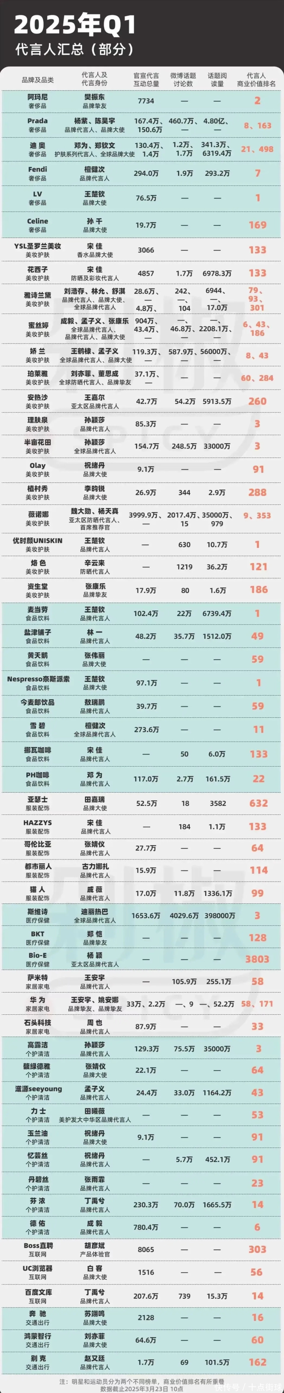 2025年第一季度勾通员和明星贸易价值榜单出炉,中国乒乓球队三位主力王楚钦、孙颖莎、樊振东包揽前三名,成为国内惟一力压文娱明星的体育顶流群体,其中,24岁的王楚钦以12个贸易代言、年收入保守预估突破5000万元的得益登顶,天然迄今为止王楚钦仍莫得三大赛的单打冠军,但其贸易价值不仅杰出同时奥运冠军,更毁坏“金牌决定论”的传统逻辑,激勉社会对体育明星价值评估体系的再行念念考;截止2025年4月,王楚钦的代言数目从巴黎奥运会前的5个激增至12个,涵盖路易威登、科颜氏、适口可乐、麦当劳、舒肤佳等高净值品牌,而樊振东与孙颖莎位列这份榜单的第二和第三位